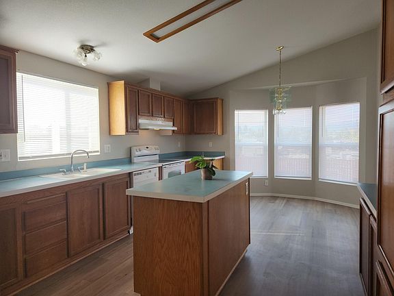 55+ Park in Desirable Suntree Village. This MOVE IN READY, 3 bedroom 2 bath 1542 sq ft home has it all, its been freshly painted inside and out, all new floors and blinds were installed, it's light and bright, has vaulted ceilings and a great lay out, living room has a wall of windows and decorative ceiling, kitchen has lots of cabinets and counterspace, a kitchen island and a sitting area with bay windows, a formal dining room with bay windows, a huge primary suite w/soaker tub, stall shower, separate his and her vanities and lots of cabinets, laundry room has a sink and lots of storage and includes the washer and dryer. Home has Carport with storage, patio, small yard and ramp, even views of the Cascade Mountains, all in walking distance to the New Larkspur Community Center, where you can swim and exercise. Must See! Wont last, make an appointment to view.