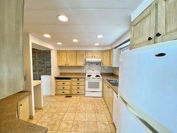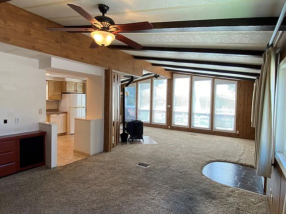 55+ park with mt views across from Larkspur park with walking trails and pools. Bright and open home with vaulted ceilings, includes ceiling to floor updated windows, roof, heat pump, pellet stove and lighting fans and fixtures. Kitchen has pull out draws with. Large utility room with office. Carport with shop and plenty of storage. All appliances included. $585.00 Seller giving 5K towards carpet repairs. Monthly space rent includes water, garbage, sewer and yard debris removal.