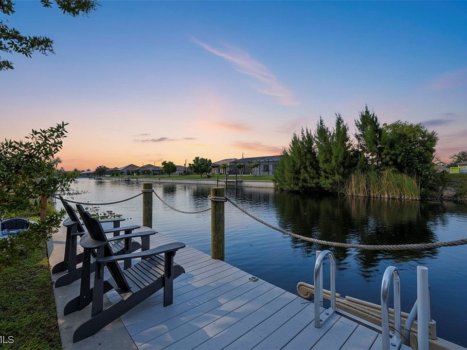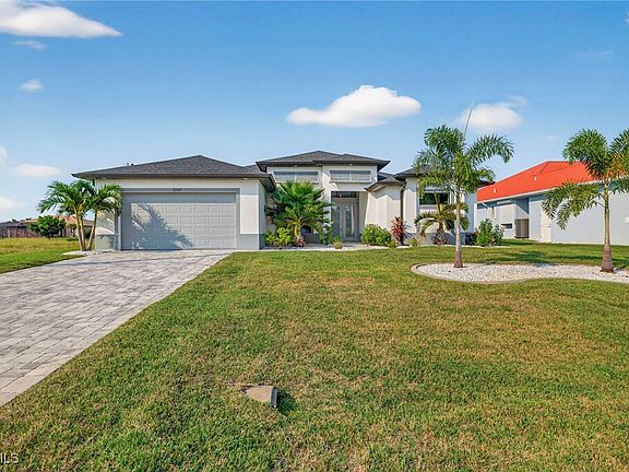 Coastal Modern Florida Living at its Finest! Waterfront Heated-Pool Home in SW Cape Coral. *All Assessments Paid* and *No Flood Insurance Required*. Experience elevated design and attention to detail in this 2021-built waterfront pool home located in the highly desirable Southwest Cape Coral. Perfectly situated on a freshwater canal with '2024 Composite Dock, this Coastal Modern residence blends refined finishes, open spaces, and a serene color palette to create a bright and elegant atmosphere throughout. Step inside to discover volume ceilings, high-end finishes, and a seamless open-concept floor plan connecting the great room, dining area, and gourmet kitchen. The adjoining office/den is thoughtfully sectioned off from the living area by a stylish sliding barn door, offering both privacy and versatility ideal for a home office or guest space. A modern electric fireplace with adjustable lighting provides an inviting focal point perfect for year round ambience, with or without heat. The home features tile flooring throughout, modern ceiling fans in every room, a walk-in pantry, and an indoor laundry room with sink for added convenience. The primary suite spans the entire right wing of the home and offers private access to the pool area. Its luxurious en-suite bath includes a slipper-style soaking tub, dual vanities, and a spacious walk-in shower. The guest bedrooms, each with walk-in closets, are located on the opposite side for maximum privacy. The guest bath includes pool access. Step outside to your outdoor oasis, the spacious undercover lanai showcases paver decking through out creating a perfect area for family gatherings and entertaining or peaceful waterfront relaxation at pool side. Enjoy the outdoor shower and take in the tranquil canal views that make this home feel like a resort retreat. Comfort and safety in mind, this home is in X Flood Zone *No Flood Insurance Required* Huge Savings! Features hurricane shutters for all Energy Efficient doors and windows, providing storm ready peace of mind and year-round comfort. The dock provides easy access for kayaking, boating, and fishing, and additional landscaping enhances privacy, creating the perfect backdrop for outdoor living. Additional features include a sprayed epoxy-style finish on the garage floor, offering durability, a clean modern look, and easy maintenance, the perfect touch to complement this move in ready home. City assessments have been paid in full, making this home completely move in ready with no additional expenses. Conveniently Located to Cape Harbour, the Westin Resort, Downtown Cape Coral, Beaches and much more. Why wait to build? This barely lived in 2021 home offers everything you need to start enjoying the Florida lifestyle today. Whether you’re looking for a full-time residence or a vacation home retreat, this property offers *Endless Opportunities* for the right buyer. Schedule your private showing today!