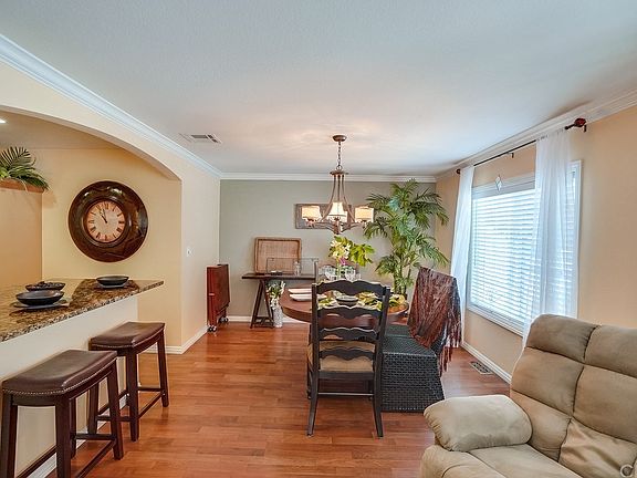 Charming brick front porch with lush greenery welcomes you home to a light, bright open floor plan with upgrades galore! Luxurious laminate wood flooring, drywall throughout, crown & baseboard molding, cove doorways, designer inspired paint, recessed lighting, ceiling fans, indoor laundry room & more! Remodeled kitchen is a chef's dream with granite countertops, stainless steel refrigerator, light wood custom cabinetry, built-in stainless steel oven & microwave, 5-burner gas cooktop, double drawer dishwasher & an oversized farmhouse sink with a breakfast bar that opens to the spacious dining area & living room. Den includes built-in desk & cabinet workspace with sliding glass door opening to tranquil, private side porch boasting herringbone brick & white lattice. Upgraded main bathroom with wainscoting, pedestal sink & soaking jacuzzi tub. Master bedroom retreat features ensuite bathroom & french doors that lead out to a lovely garden patio. The enchanting landscape beautifies the entire residence including an herb garden at the bbq area. 3 storage sheds should accommodate all your needs. Covered carport and a brick staircase leads to the back entrance. Ideally located across from community clubhouse with exercise room, the grounds include putting green, walking paths, gazebo, picnic area, swimming pool & jacuzzi. Resort style senior living in sought-after Friendly Village 55+ community!