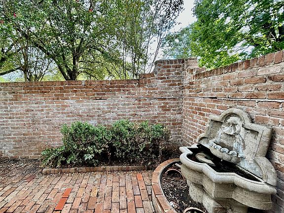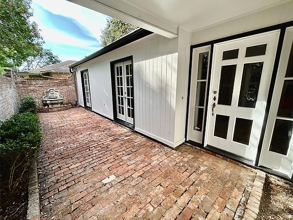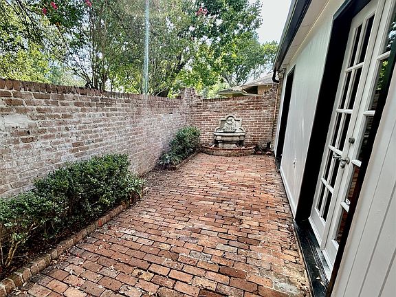 Four bedroom home in Briargrove Park with updated kitchen and bathrooms. Kitchen includes glass front cabinetry and modern finishes. Hardwood floors throughout the main living areas. Primary suite features a renovated bath with walk-in shower and updated fixtures. Additional bedrooms share updated secondary baths. Private courtyard at the front entry provides an outdoor sitting area. Backyard is landscaped with mature trees and greenery, surrounding a pool and spa. Gas light at front entry.
