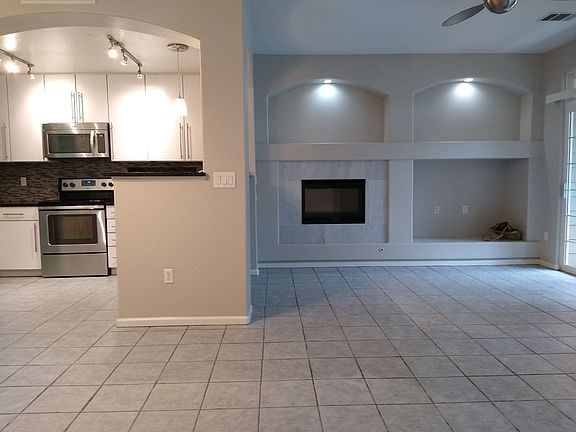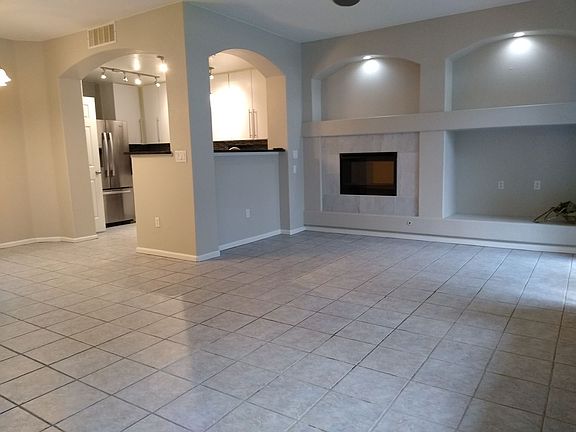 The open floor plan is accentuated by tile flooring throughout, lots of windows for natural light, a cozy fireplace with beautiful tile work and a walk out covered patio.