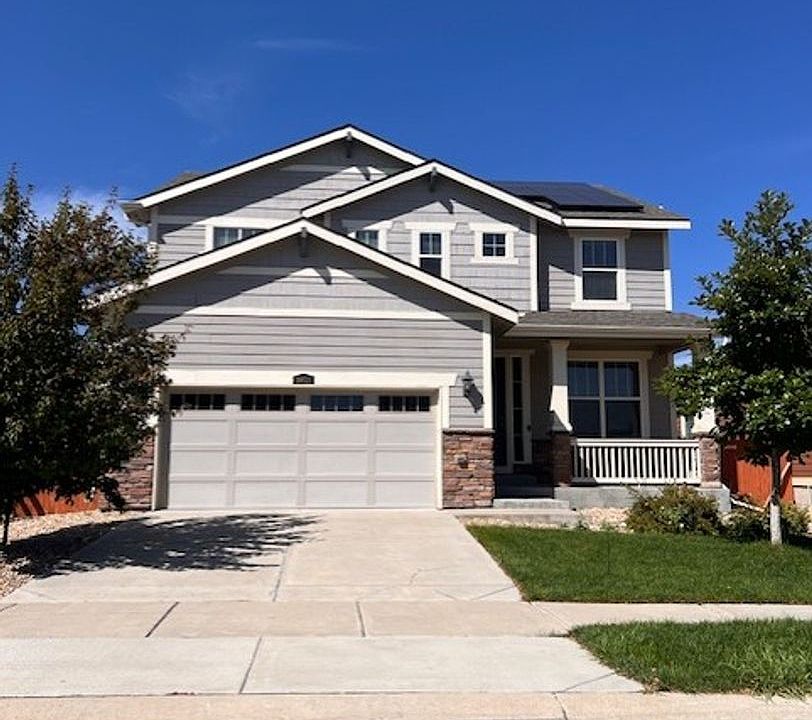 Welcome to this beautiful 4-bedroom, 3.5-bathroom house located in the Sierra Ridge neighborhood of Parker! This lovely home features over 2,400 square feet of finished living space plus an additional 1,117 sq ft in the unfinished basement! As you enter through the front door, you'll find a spacious office with lovely French doors, a half bathroom, living room complete with a gas fireplace, and a large kitchen with stainless steel appliances plus an island, perfect for hosting and entertaining!