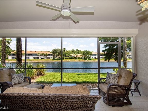 This one is a can't miss! Come and check out this perfectly updated and beautifully appointed, first floor end unit carriage home at Colonial Country Club. This popular Sandpiper Model has it all! Sold mostly furnished and includes a Full Golf Membership. Pride of ownership is evident as you walk in the front door! Enjoy the beautiful waterviews from your triple sliding glass door in the living room. Everything is painted in contemporary coastal colors- all very peaceful and appealing to the eye. The flooring is light colored luxury vinyl plank throughout the unit- no carpeting. The kitchen has been beautifully updated to include light colored quartz countertops and complimentary decorative tile backsplash; newer stainless steel appliances; recessed and pendant lighting. There are a number of options for dining indoors including in your formal dining room where 8 people can easily gather for a meal, at your breakfast bar or al fresco on the screened lanai with Noseeum screens. The Storm Smart electric awning provides privacy and storm protection on the lanai at the touch of a button. All other windows have easy operation accordion shutters. The large primary suite includes a custom oversized walk-in shower; dual vanities; two walk-in closets plus a separate linen closet and an oversized sliding glass door that leads to the lanai. The guest room offers private and spacious accommodations with an adjacent bath with tiled tub and shower. Behind the french style doors, the den provides a space for a home office and the Murphy Bed with additional storage incorporates into the room for coveted extra guest space. An attached garage provides a space for a Golf Cart and ample storage for all of the accoutrements of your outdoor sports! Colonial Country Club is conveniently located just off I-75 close to SWFL'S amazing restaurants, shopping and beaches. Residents and their guests are offered the finest amenities including: Bundled golf with full membership at the Gordon Lewis designed and Troon Managed golf club; numerous lit clay tennis courts; newly refinished pickle ball courts and two bocce courts- with leagues galore; a state of the art fitness center; a beautifully remodeled Clubhouse with full restaurant and bar with a full slate of special events with entertainment; a library; several sparkling community pools; miles of winding streets with sidewalks and even a large wooded wildlife preserve within the gates. Since Troon manages the Golf operations, owners have the opportunity to play on-site at the Gordon Lewis designed course as well as numerous other acclaimed golf opportunities throughout Florida and Worldwide when they travel. Nothing to do but move in to this fabulous and friendly gated community and enjoy the good life! Just toss your clothes in the closet, grab your clubs, racquets and swimsuits and get playing!