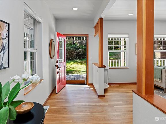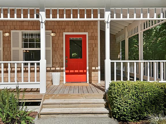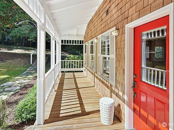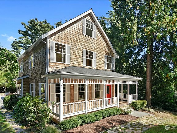 Quintessential Bainbridge! Charming shingled home down a long driveway on a private 0.81-acre property. Step onto the wraparound porch and through the farmhouse red front door and feel welcomed by hardwood floors, vertical grain fir trim, and abundant natural light. The flowing main floor plan features kitchen open to family room with vaulted ceilings plus spacious living and dining rooms. Generously sized, light-filled bedrooms with fir floors and finished 3rd floor flex space with a peek water view. Outside find a large deck that wraps around the west side of the house to the back yard and a stone patio – perfect for enjoying evenings around a fire pit. The sunny back yard has several fruit trees and room for additional gardens.
