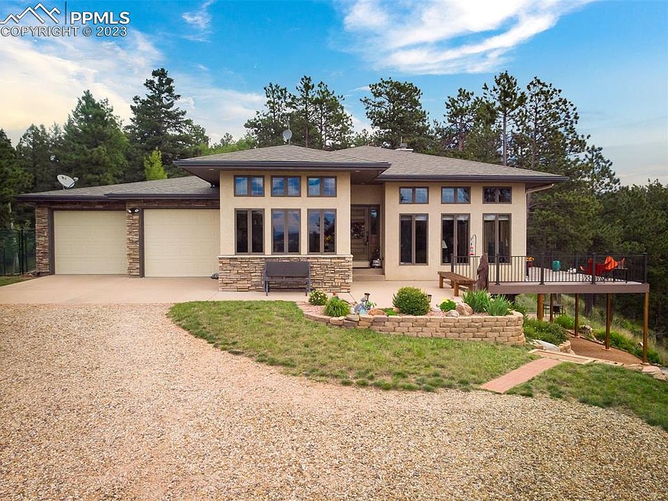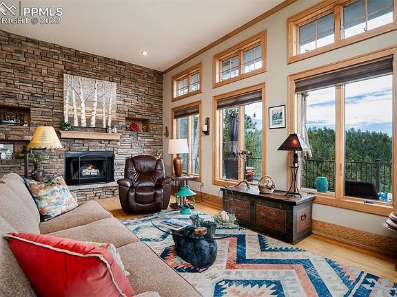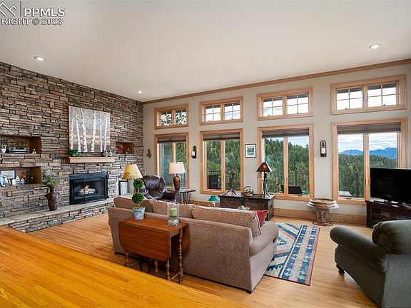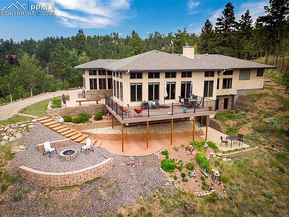 Welcome to your serene mountain hideaway, nestled in a private gated community on 5 acres, just 20 minutes west of Colorado Springs up the beautiful mountain pass. This custom-built ranch-style home by Michael Thompson offers superior quality & breathtaking views that stretch from Pikes Peak to the Collegiates. Step inside, you'll be greeted by a grand living room with a cozy fireplace & a formal dining room with gleaming wood floors. The 12 Ft ceilings create an airy & open feel, enhanced by the floor-to-ceiling Anderson wood windows that showcase the stunning vistas.The kitchen is a chef's delight, featuring Corian counters, 2 pantries, a gas cook top, built-in microwave & skylights that fill the space with natural light. Formal dining room is complete with an impressive wall of view windows. The main-level primary suite is a true retreat W/ spacious 14x11 walk-in closet & a luxurious master bath complete with a jetted tub, glass-block shower, two separate vanities, a linen closet & direct access to large laundry room. The lower level features a family room with 10-foot ceilings, providing the perfect space for a home theater & billiard room & 3 more nice sized bedrooms and loads of storage space. The comfort of radiant in-floor heat & the convenience of a 1000-gallon underground propane tank ensure cozy living year-round. You'll have plenty of space for your vehicles & hobbies in the 4-car tandem garage, W/an interior bay door, perfect for workshop & fitness area. Not only does this home offer luxurious living inside, but it grants you access to the wonders of nature just outside your doorstep. Backs to Pike National Forest, providing endless opportunities for hiking. Enjoy a 2-mile hike to Rampart Reservoir or a quick 15-minute walk to Bald Mountain. If you love water activities there is a neighborhood access to Rampart Range Road/ Reservoir just a short drive away (boat ramp only 15-20 minutes) Don't miss this incredible opportunity to own a piece of paradise!