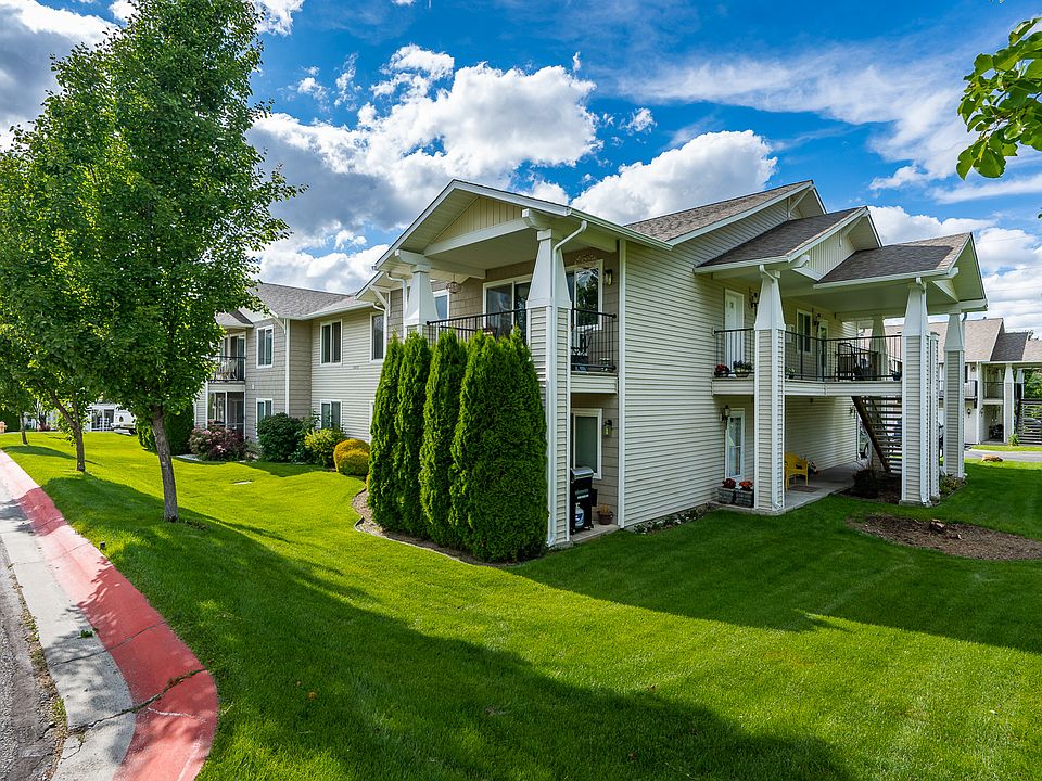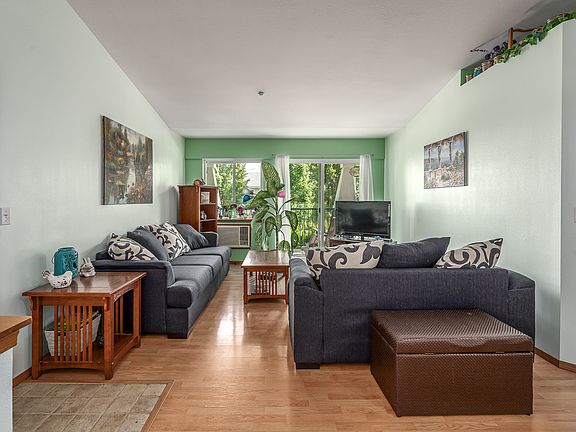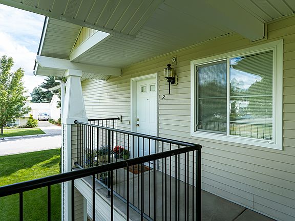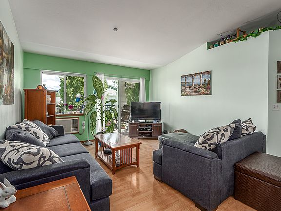 Low Maintenance Living! Fantastic 2 bedroom, 1 bath condo. Spacious living room with vaulted ceilings and a fabulous concrete balcony overlooking greenbelt. Large kitchen with plenty of cabinets and a pantry closet. Separate dining area. Beautiful laminate flooring. Large primary bedroom with walk-in closet and recently updated paint and flooring. Laundry in unit. Fully finished single car garage with storage shelves. All of this, overlooking a quaint park.