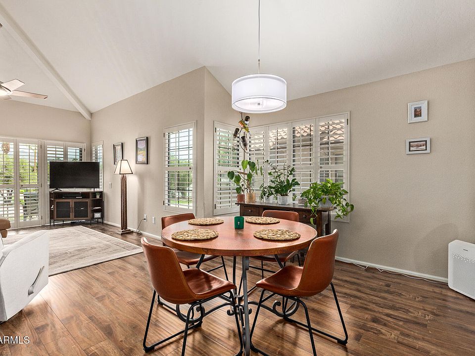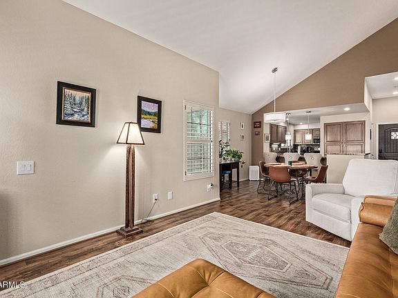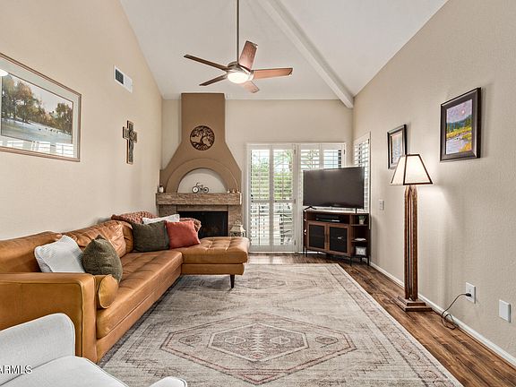 Contemporary comfort meets functional elegance in this stylish 2 bed, 2 bath condo designed for easy living and effortless entertaining. The split floorplan offers extra privacy, while vaulted ceilings, laminate wood floors, and shutters throughout create a bright, airy vibe. Unwind in the primary suite with a walk-in closet and spa-style bath featuring dual sinks and a sleek standing shower. Guests will love their private room with a 3/4 bath, reach-in closet, and makeup vanity. Smart storage includes a coat closet, laundry area with stacked LG washer/dryer, and garage cabinets. Enjoy cozy nights by the wood-burning fireplace or soak up the sun on your front patio or private balcony, perfect for your morning coffee or evening wine!