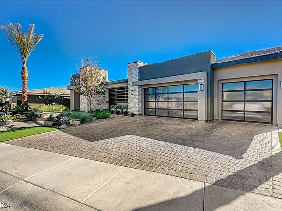 Stunning, opulent and sophisticated is where we start. Over 4000 sqft with the finest of finishes. Located in Onyx Point, gated community in Summerlin South over 300k spent on Entertainers back yard with Amazing mountain, city and strip views. Huge Pool + spa, w waterfall, swim up bar & covered sunken out door kitchen area, builtin gas heater in covered patio, 4 large bedrooms all en suite, with secondary mini primary, all have walk in closets, 3 1/2 baths, + office + 20x20 game room w/wet bar, massive great room w fire place, exposed beams, herringbone pattern flooring throughout. Gourmet kitchen with Stainless steel appliances, Advantium Microwave/Cooking oven + 2 more ovens below the 6 burner Range Cook top with Griddle & Pot Filler, 2 Dishwashers, Quartz Counter Tops, Massive walk in Pantry & separate butlers pantry w/ Wine Fridge. Laundry Sink w/ Lots of Cabinets, oversized 3 car garage with glass doors. Over 600k spent on the interior upgrades & finishes. Solar paid in full!
