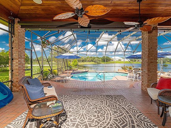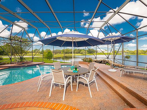 Villa Lago sits on GlenLake's premier cul-de-sac, a lakefront lot overlooking GlenLakes country club. This well-designed floor plan is loaded with quality moldings and thoughtful details throughout the 5, 549 square feet of living space featuring a four-bedroom 4.5 bathroom layout with an oversized three-car garage deep enough for your golf cart. Enjoy the seamless transition outdoors through a covered lanai and screened-in pool. Lounge in your resort-style pool area overlooking gorgeous landscaping and lake view, or take a few short steps directly onto the GlenLakes Country Club's first hole fairway. You enter the home through a magazine-like foyer featuring a grand spiraling staircase. The vaulted entrance connects you to the formal dining room, sprawling sitting room, and living room. The living room has soaring ceilings, a dramatic fireplace, a wet bar, extraordinary views of the pool and lake, and plenty of room for seating or entertaining. A state-of-the-art kitchen features Thermador appliances, a trash compactor, a spacious island, a large eat-in kitchen, a butler's pantry, dual gas range, and recessed lighting. The custom-built office is one of a kind. It boasts recessed lighting, beautiful coffered wood ceilings, custom cabinetry and shelving, and distinct craftsmanship that is unprecedented. Completing the downstairs, you will find a prominent owner's suite overlooking the lake and a lavish ensuite bathroom. After ascending the wide spiral staircase to the second level, you will find two bedrooms with ensuite bathrooms both with separate showers and jacuzzi tubs, another office space, flex room that can be used as a bedroom or another family room. Rounding off the second level, you will find a sun-splashed room with a terrace that you can use as another office, art studio, workout space, or reading room.Your outdoor living space is generously equipped with an outdoor kitchen decked out with high-end Gaggenau appliances. It includes irrigation for plants throughout the pool cage, Kichler accent lighting installed in the front and back yard, and irrigation well water. The outdoor space is professionally landscaped with an eye towards seasonal color and carefully added shade trees with a brick paver driveway and walks winding throughout. In addition, Villa Lago's outdoor space is perfect for relaxing and entertaining in the saltwater (heated) pool, hot tub, or seating area with a custom sun shade to keep you cool. And to top off this fantastic outdoor space, Villa Lago has a mini golf pad for you to work on your golf game by hitting retrieved floating balls back into the lake which serves as an aqua driving range. This home also features a Decra 50-year roof, a whole house water valve, a 3-year-old on-demand water heater, and an oversized safe securely bolted to the floor. The GlenLakes community is named the Top 50 Community by Ideal-Living magazine; this gated, 24-hour on-site guarded community offers fantastic privacy and lifestyle with country club amenities (including a pool, gym, tennis court, banquet rooms, dog park, pickle ball courts, and restaurant), golf cart-friendly streets, and miles of trails and nature reserves at your doorstep.