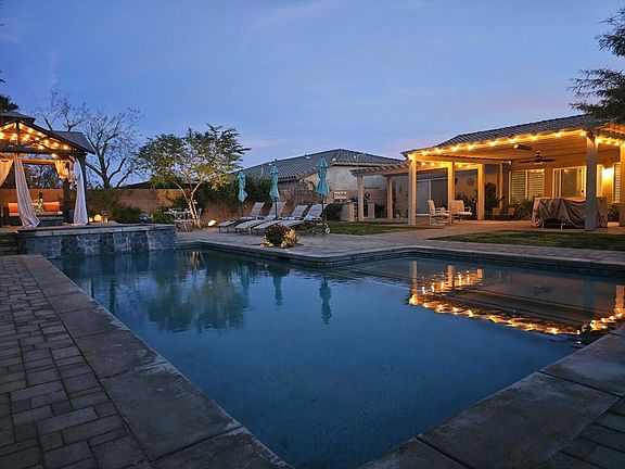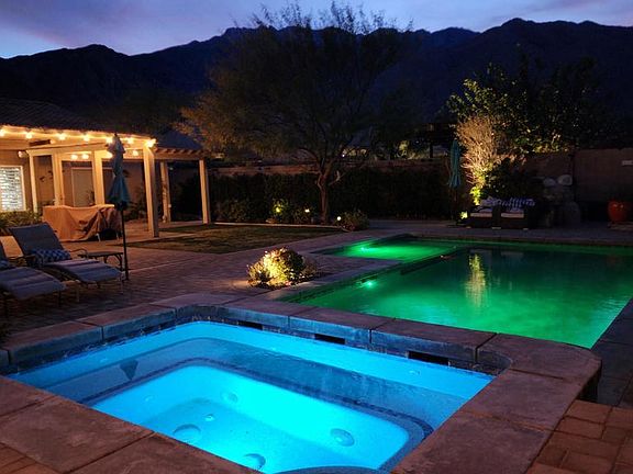 This is a spectacular floor plan with all the bells and whistles. Large 4 BD, 3 BA PLUS bonus room either casita or bedroom with closet which opens to inside and out. Bathrooms were recently updated. Home has Solar lease (low payment) , AC is 3 years old. Backyard has mountain views, large salt water pool, patio cover with misters, gazebo with Fire pit, BBQ, Outdoor shower, RV Parking with hookups., pavers and patio cover, and shuffleboard. Other upgrades include speakers inside and out, nest thermostat, large kitchen with raised bar, new stainless steel appliances, pantry, fireplace, ceiling fans, tile floors, inside separate laundry room with newer washer and dryer. Community has tennis courts, basketball court, 3 pools and spas, walking trails, playground, built in BBQ, roving security and social club. Located just off Palm Canyon, a short drive to dining, shopping, entertainment and PS Tram.