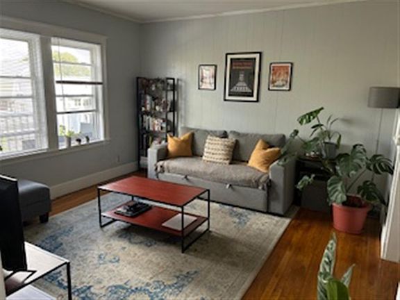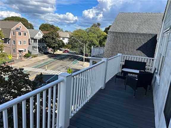 Large and sunny renovated third floor unit has gorgeous hardwood floors throughout. Semi-open concept between the spacious living room and dining room creates a great flow naturally into the updated kitchen. Completed with cherry cabinets, granite counter tops and an island with storage. Nestled between all of the cabinetry are stainless steel appliances that include a gas stove, dishwasher and refrigerator also with under mounted sink and an in sink disposal. Free and private in unit laundry is located just off the kitchen. A small back hall with storage space provides access to a private rear porch. The other side of the house consists of a large office that leads to the street facing 25 foot wide deck. Two equal sized bedrooms are located at the rear of the house each with good closet space. The bathroom also has been renovated recently and it looks fantastic. This unit is located under a 10 minute walk to Davis Sq and is a very short drive to Routes 93, 2 16 and 38.