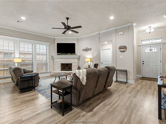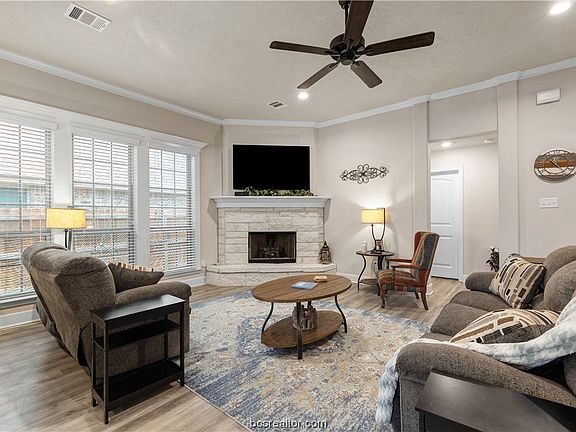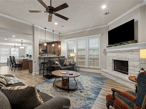 Welcome to the fantastic and highly sought after Dove Crossing neighborhood! You’re going to feel right at home in this beautiful 4/3 house with tons of storage and lots of natural light! Walking in, you’ll love the raised ceiling, generous living space and inviting floorplan. The main living area boasts a substantial and gorgeous limestone fireplace. The primary suite features a tray ceiling, en suite bathroom with separate granite vanities, corner soaking tub, walk-in shower, and sizable walk-in closet with built-ins and outlets. The spacious kitchen features granite countertops, tile backsplash, gas range, plenty of cabinet and counter prep space, plus an island and an eating bar. Just off the kitchen there is a fantastic breakfast area. Each of the remaining 3 bedrooms are generously sized with spacious walk in closets Windows that receive high sunlight have been fitted with solar screens and your AC is only 3 years old and high efficiency! There are plenty of places to store linens, games and other items in this well designed home! There is gorgeous new wood look vinyl plank flooring throughout the house. This laundry room is perfect for any size household - with a large amount of hanging and folding space! A fully privacy fenced backyard and 2 car garage complete this property. Schedule your tour today!