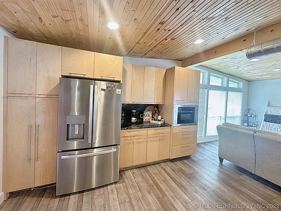 The oversized primary bedroom features two walk-in closets, and the hall bath features a tiled shower with a rain head. The excellent natural light and all lighting on dimmers provide a cozy and comfortable ambiance. The LED kickplate lighting and tongue and groove ceilings add custom touches throughout the home, making it truly one of a kind.