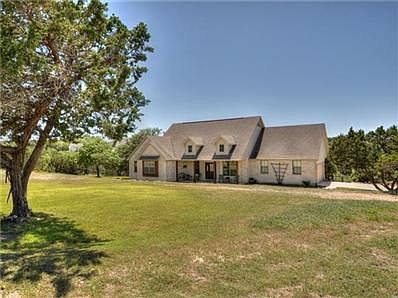 Panoramic Hill Country views from Ranch-style home on approx. 1.76 rolling acres w/ wet weather creek. Inviting front porch, high ceilings, stained concrete floors, new carpet, fresh interior paint, recent appliances, lots of light, comfortable master suite, spacious secondary bedrooms, open kitchen, breakfast and family room anchored by limestone fireplace. Huge utility off kitchen, workshop area in outbuilding, terraced back yard, fenced garden, fire pit, playhouse, roses & wildlife for you to enjoy!!
