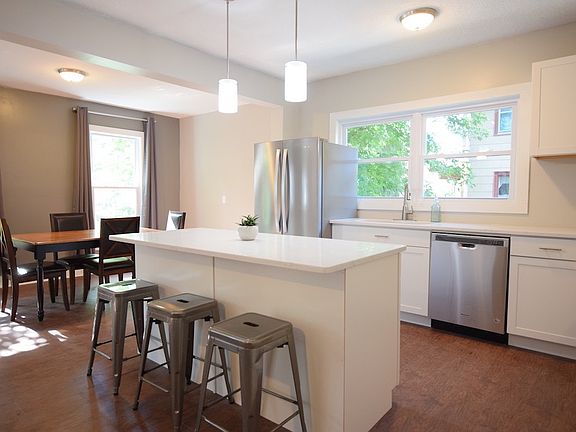 Modern lightingWasher and dryerStainless steel appliancesIsland and bar seatingWhite quartz countersSun roomSpacious eat-in kitchen