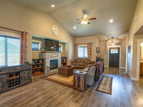 Stacked stone gas fireplaceCustom built-in bookshelvesSpacious covered front patioFull sprinkler systemFully tiled primary showerLaminate wood flooringKnotty alder cabinets