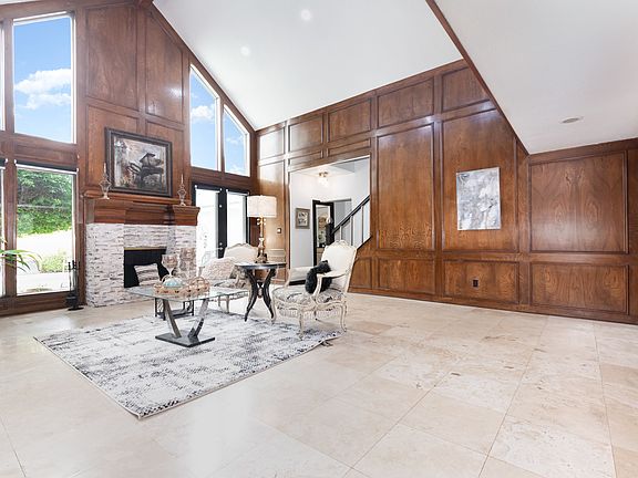 The drive-up curb appeal is enhanced by stately double doors that open into a great room with cathedral ceilings and expansive floor-to-ceiling windows, creating a light-filled, welcoming space.