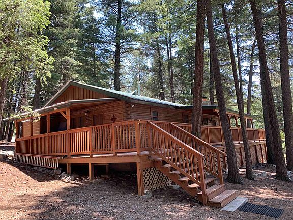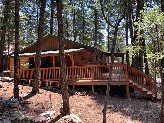 This Log cabin offers 2 bedrooms 1 & 1/2 bath with 1326 sq. ft. on 0.16 acres. Property offers a sizable area for parking and a partially fenced area for pets. This Log cabin is a single level home with a spacious open floor plan that flows nicely for large gatherings. Enjoy the healthy forested surroundings from large redwood decks on 3 sides mostly covered and partially open. Home has been beautifully redesigned & remodeled with the original wood floors & vintage porcelain kitchen sink. Kitchen features an island with a gas stove, drawer storage along with a large walk-in pantry. Dining/living area has a unique corner picture window and stone fireplace w/pellet stove insert. This mountain cabin is conveniently located near the local Zenith park for recreation and only a short walking distance to downtown Cloudcroft. This location is a short distance from Hwy 82 thus making location convenient and accessible throughout the year especially during the snowy winter months. Property has a charming appearance inside and out. Prime property and in a prime location!!! Make an appointment to view this property before its gone. Bring offers!
