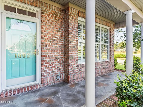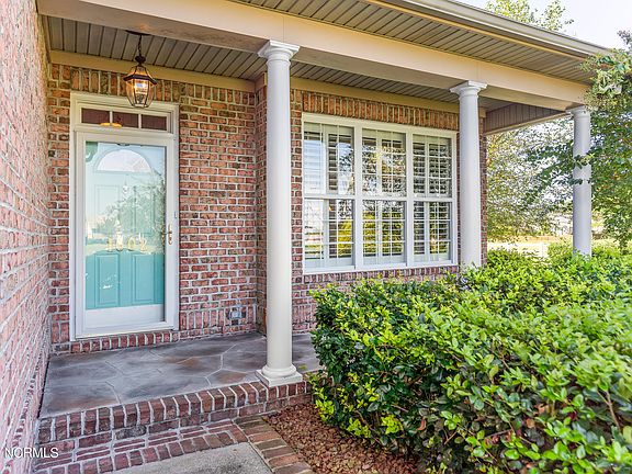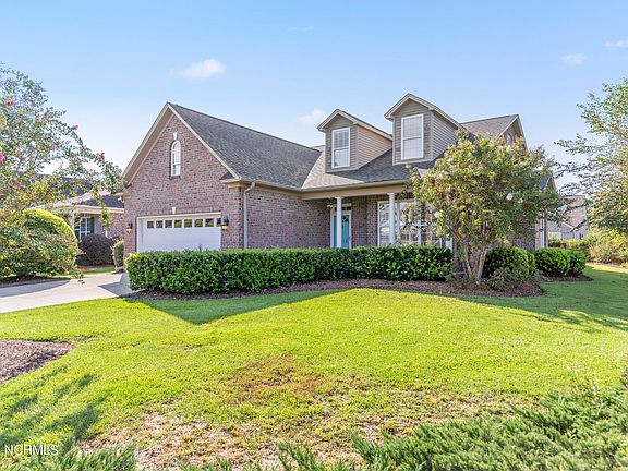 Stately brick-faced home with manicured shrubs and covered entry on sweet corner lot in established community of Magnolia Greens. Formal dining upon entry. Eat-in kitchen with granite counters and tile backsplash open to living room. Common area details include hardwood flooring, built-in shelving units and focal fireplace, doorway arches, crown molding, recessed lighting, plantation shutters. Guest rooms with shared full bath to left of common area. Primary suite with private bath at rear of layout. Bonus room above the garage has attached full bath and oversized closet. Large outdoor living space accessible from living room and master suite—enjoy stepdown patio with enclosed courtyard overlooking yard edged with mature foliage. Residents enjoy use of rec center with fitness room, lounge, meeting area, lockers, showers, and sauna; two swimming pools; lighted tennis, basketball, and pickleball courts; playground & picnic area; 27-hole course, clubhouse and pro-shop. Less than 10 miles to diverse shopping and dining in Leland proper, historic downtown Wilmington riverfront.