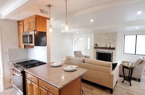 Property Id: 253565 Remodeled Mission Hills Home Newly Remodeled 3 bedroom home in Mission Hills. Updated kitchen and granite counter tops with peninsula. Brand new appliances and freshly painted. New wood-style laminate throughout the house. Both bathrooms spacious and completely remodeled. Vaulted ceilings throughout the house and hardwood floors in 2 of the bedrooms. Great curb appeal, sprinkler system in front and backyard, with a brick patio.