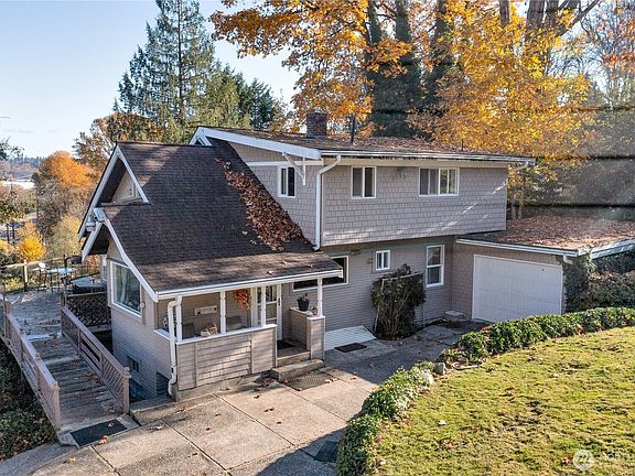 Full of character, space, and potential, this classic home sits high above the street allowing it to capture the morning light and mountain views from its wraparound deck. The open living and dining rooms showcase a wall of windows, while built-ins, clever storage nooks, and laundry chutes add vintage appeal throughout. Beautifully refinished hardwood floors shine upstairs, with possible hardwoods beneath the main-level carpet. Enjoy the retro kitchen with built-in eating nook, partially finished basement, and both attached and detached garages. Terraced, mature landscaping offers privacy on this 18,900 sq ft lot zoned R-6—perfect for an ADU or DADU. Conveniently located near freeways, airport, and more!