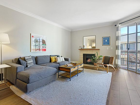 Fantastic opportunity to own a top floor 2 bedroom, 2 bath condo in excellent proximity to restaurants, shopping and the Palms Station Expo Line. West facing corner unit with only one common wall offers great afternoon light, and features high ceilings and crown molding throughout. The spacious living room offers a fireplace and balcony overlooking the courtyard. The kitchen includes brand new stainless steel appliances, new tile flooring and an adjacent eating area. The master bedroom features large windows, balcony access, a bathroom with dual sinks and a walk-in closet. The large second bedroom has its own balcony and walk-in closet. Recently updated with new paint, fixtures, shower doors, and toilets. Additional features include a separate laundry area with full size washer/dryer, central HVAC and 2 parking spots. The interior common area has just been renovated with new carpet, paint and light fixtures. The complex offers a swimming pool, fitness room and patio sitting area.