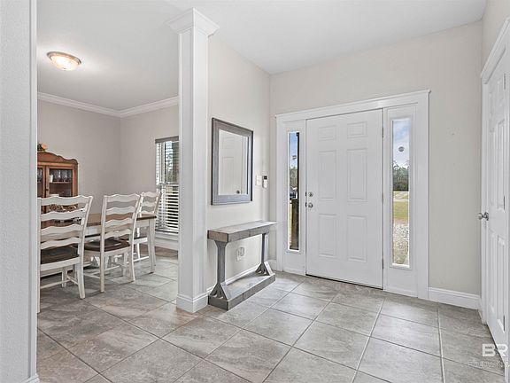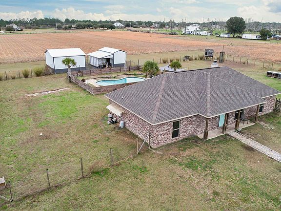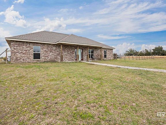 $10,000 BUYERS CONCESSIONS - 5 manicured acres in Elberta with a 3 bedroom 2 bath brick home. This split floor plan features 9ft vaulted ceilings, granite counter tops, stainless steel appliances, spacious cabinetry and custom industrial shelving in kitchen, dual shower heads in master bathroom, double flush toilet, custom built utility shelving on wheels and much much more (TV in main living area included)! This home was built to Alabama’s Gold Fortified Standard in 2019 and the certificates are available upon request. Main area flooring replaced and custom blinds installed throughout in 2022. The back yard is fenced with a natural bamboo material and landscaped, including Palm Trees. The property boasts a stocked pond, a custom fenced in swimming pool with partial shade (pool chairs included in sale)and 2 separate workshops (pool table included, lawnmower is negotiable). There is full RV electric hook-up and sewage available, as well as a kids clubhouse, zip line and yard chickens. Simply safe interior and exterior cameras are included, as well as, a Ring doorbell. This stunning property with immense amenities is not one you want to miss! Conveniently located near Pirates Cove, Barbers Marina and the Gulf, this home offers endless opportunities for gardening, fishing, kayaking, boating and more. Seize the chance to experience the best of coastal living!