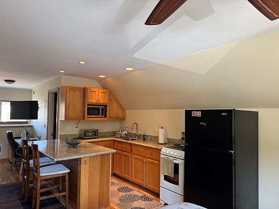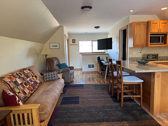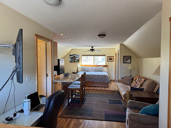 The apartment is located above the detached garage. The main house is located next door to apartment where owners lives. There is a small pottery studio and gallery located in the garage. The property is on an acre of land and located very close to The Legacy trailhead, Glenshire General store, Glenshire Pizza, a small salon and The Shire yoga/exercise studio. We are interested in renting as a midterm rental (1-6 months) or as a ski lease.