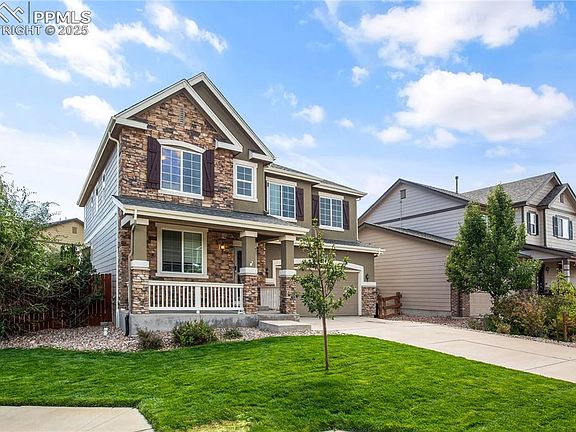 Welcome to 10025 Beryl Drive, a spacious 5-bedroom, 3-bath Richmond home on a large corner lot in Meridian Ranch offering nearly 3,800 sq. ft. of living space, new hardwood floors, plush carpet, and a versatile 5th bedroom perfect as a guest room, office, or flex space. The updated kitchen features granite countertops, oversized pantry, new microwave (2025), gas range (2019), and dishwasher (2020), complemented by a brand-new tankless gas water heater (2025) and whole-house water softener and purifier (2025). The open-concept family room with a gas fireplace creates a cozy atmosphere, while the luxurious primary suite boasts a coffered ceiling, walk-in closet, and a spa-like 5-piece bath with double vanities, jetted tub, and freestanding shower. Additional highlights include fresh interior paint (2021), a fully fenced yard (2017), oversized 2-car garage with opener (2019) and new rollers (2025), and access to Meridian Ranch’s resort-style amenities—pools, fitness center, golf course, trails, and more—all within District 49 schools and close to Peterson, Schriever, and Fort Carson. Move-in ready, this home perfectly balances comfort, style, and modern convenience.