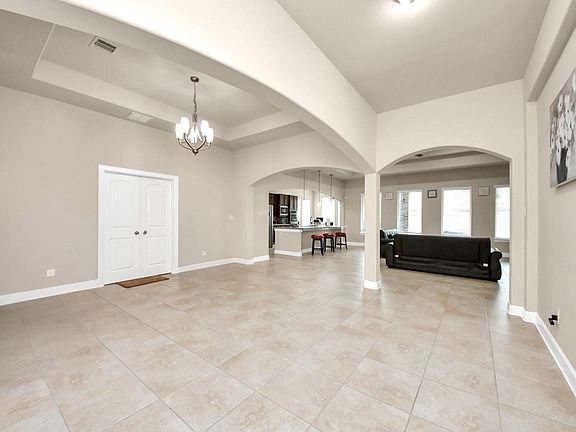 Dedicated office spaceInviting entrywayOpen-concept floor planLarge backyardClean tile flooringCovered patioTall ceilings
