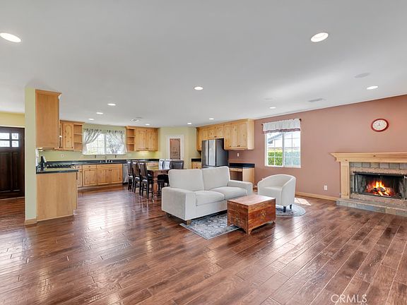 Charming Chatsworth Pool Home! Features include four spacious bedrooms and two bathrooms. The main living area has been expanded and remodeled into a stunning open concept space. The huge kitchen features upgraded counters, a large farm sink, lots of counter and storage space, walk in pantry, and new stainless steel stove/oven, dishwasher, and refrigerator, with plenty of room for a large dining table. The kitchen opens right up into the living room, with a cozy gas & wood burning fireplace and a slider leading to the back patio. Both spaces with hardwood flooring, smooth ceilings, and recessed lighting. A gorgeous space, perfectly set for entertaining or relaxing, with a nice flow inside and out. The four bedrooms include a primary suite with a private, attached en suite 3/4 bathroom. The three other bedrooms are nicely sized, one with direct access to the garage, and all share a full bathroom at the end of the hall. The back yard features a covered patio, a sparkling pool, lawn space, mature fruit trees, and a raised patio at the side of the pool. A great outdoor space to gather or just hang out, especially on those warm summer days! The front yard is raised from the sidewalk with a stacked stone retainer and features a stamped concrete driveway and walkway. Attached, direct access two car garage. Dual pane windows. Smooth ceilings throughout. Recent updates include a new A/C and furnace in 2022. The pool was resurfaced & tiled with new plumbing within the last year and the filter was replaced within the last two years. A beautiful, immaculate home on a quiet tree lined street!