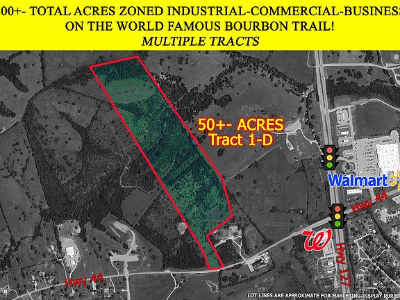 TALK ABOUT LOCATION, LOCATION, LOCATION!!! This exceptionally located property sits at the intersection of directly on the World Famous Bourbon Trail and is located at the JCT of HWY 127/HWY 44. Property contains a total of up to 200+- acres and is zoned for Industrial-Business-Commercial mixed uses. THERE IS ALSO OTHER LAND OPTIONS HERE WHICH CONTAIN HARD CORNERS @ MULTIPLE TRAFFIC LIGHTS WITH DIRECT ACCESS TO THE PROPERTY ACROSS FROM WAL-MART, WAL-GREENS, AND MANY MORE! Property lends itself well for approximate 50 front acres to be utilized for commercial (Restaurants? Hotels? Retail? Brewery? Service Stations?) and approximate 150 acre rear portion to be utilizes for industrial (Bourbon Warehousing? Manufacturing plants? Distilleries? Industrial Factories?) Huge natural gas, electric, public water, public sewer, multiple manholes all available at the property. Seller may consider selling in 20 acre tracts minimum on certain portions of the property. Call today to schedule your showing!
