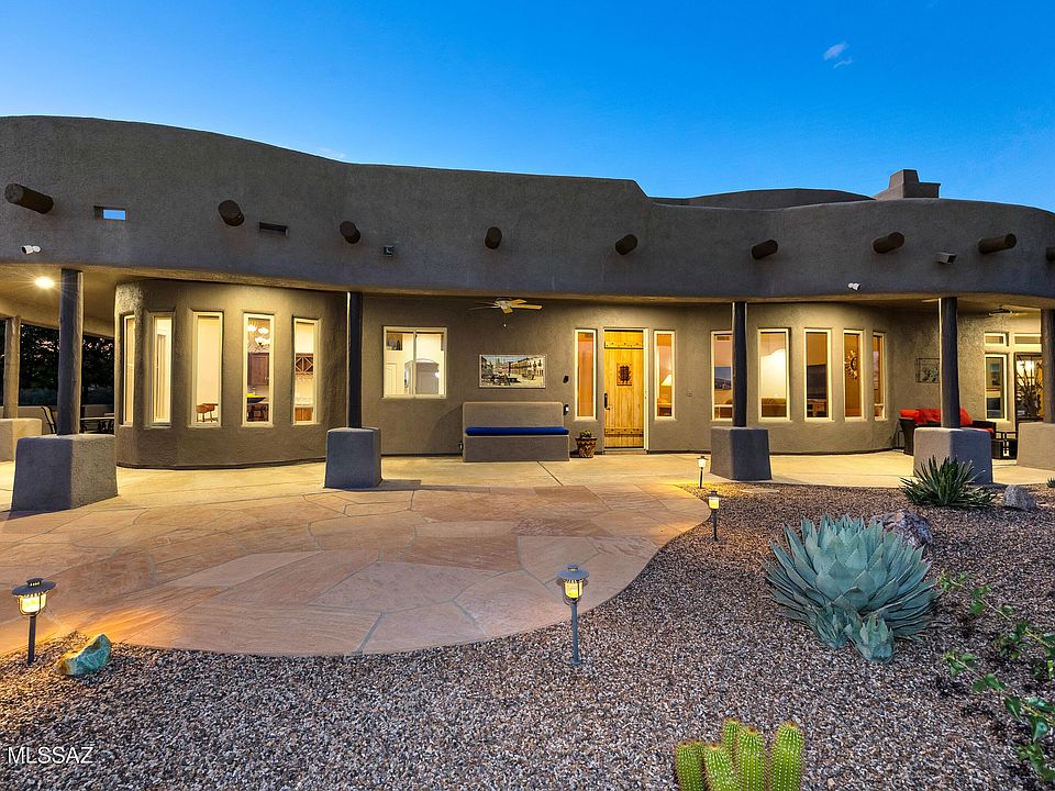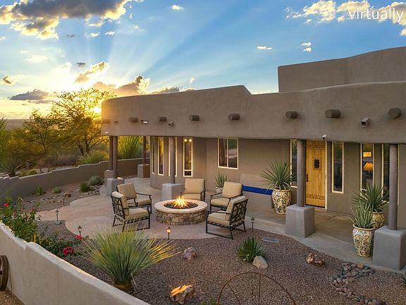 Discover an extraordinary sanctuary where luxury meets nature's grandeur. This exceptional residence commands breathtaking panoramic views of the majestic Santa Rita Mountains from every living space, creating an ever-changing tableau of natural beauty that serves as your daily backdrop. Tremendous curb appeal is created by an extraordinary front courtyard featuring an expansive patio that perfectly frames the spectacular mountain vistas. This magnificent outdoor space serves as your personal theater for morning coffee rituals or elegant evening gatherings around the fire pit, where the Santa Rita Mountains provide a dramatic and ever-inspiring stage. Inside, drama unfolds at every turn. Soaring wood-lined ceilings create cathedral-like grandeur, while highly customized windows frame the mountain views like carefully curated artwork. Architectural poetry is exhibited through arched passages and thoughtfully placed niches, each detail crafted to enhance your daily rituals. An open kitchen flows effortlessly into the living area and features thick-slab, natural-edge granite that seems to glow against rich chocolate cabinetry, creating a space where culinary adventures and conversation flow as naturally as the mountain breezes.