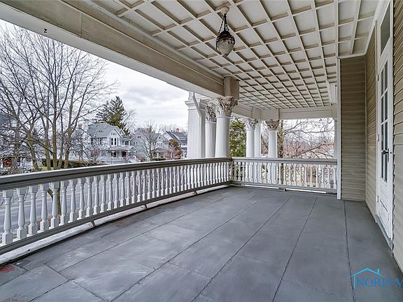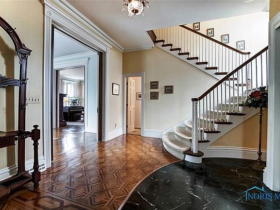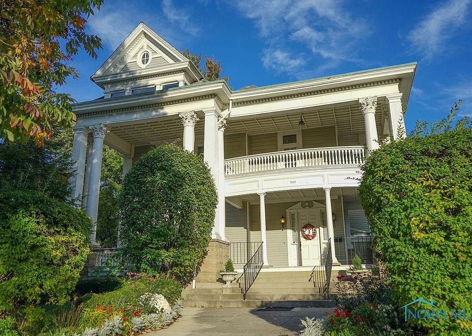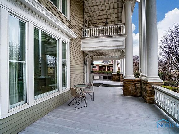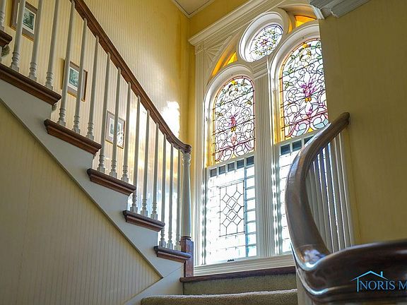 PRICED TO SELL Enjoy the perfect mix of warmth and elegance in the heart of Findlay An expansive front porch and balcony offer inviting areas to gather and take in parades and other local events. Inside you'll find comfortable, open spaces perfect for entertaining. From the unique inlaid wood floors to the stained-glass window featured on the grand staircase, the historical charm of this home envelopes you from the moment you enter. The third floor presents unlimited options for additional living space. Fenced-in backyard plus garage complete with covered walkway and second floor storage.
