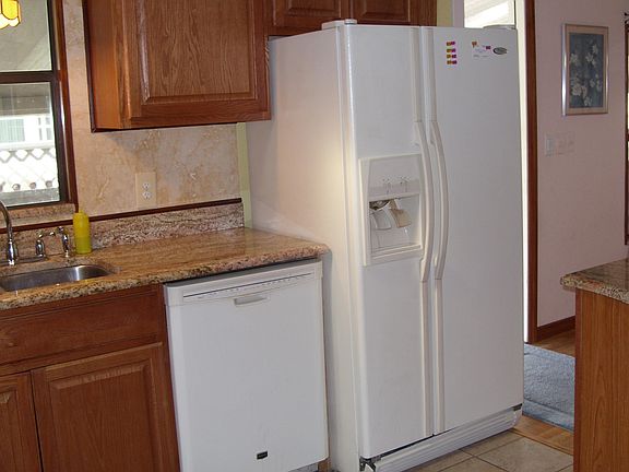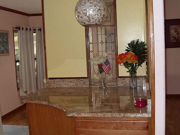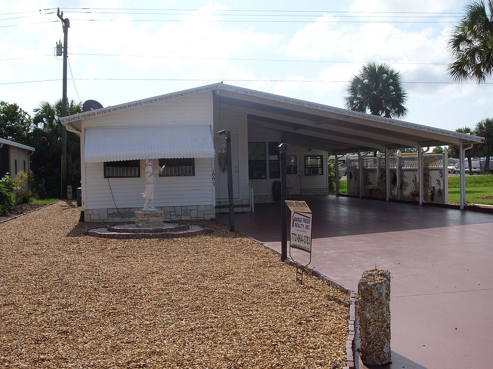 BRAND NEW SHINGLE ROOF!! Eco friendly yard needs no watering. Kitchen has side by side refrigerator and granite countertops. Laminate flooring in dining room, living room and bedrooms. Ceramic tile flooring in kitchen and bathrooms. Cathedral ceiling an added plus. Has a mother in law suite with private entrance and new carpeting. 16' x 11' front room may be used as 3rd bedroom. Indoor washer and dryer hookups. Oversized carport and driveway, great for your visitor's parking. Roomy 10' x 11' shed for your work area and additional storage. The yearly $816.00 paid to Barefoot Bay Recreation District is included in the amount of the yearly real estate tax bill.