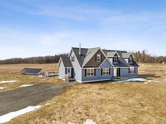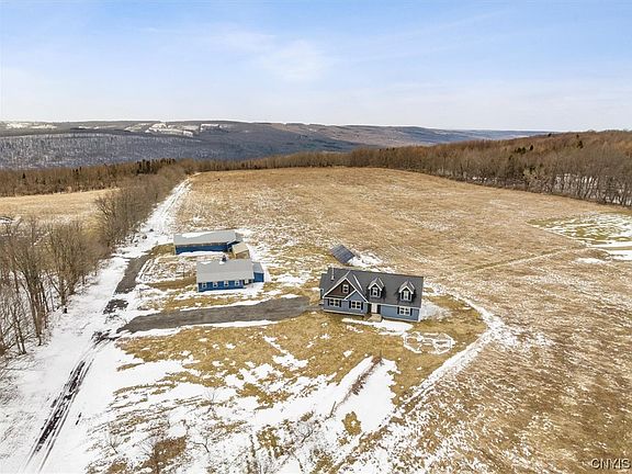 76 acre agricultural farm, open concept, 2 story, 4 BR, 2 Bath. Eat-in kitchen and first floor laundry. Basement is fully insulated with 8 foot high ceilings. The second floor has a large bedroom and spacious multi-purpose room. This home is heated by an electric forced air furnace and/or wood stove. Ground mounted 8.8 kWh solar panels located behind the home. Above ground pool with attached deck. Land has 30x40 pole barn with poured concrete floor and attached workshop (all equipped with electricity). The property also has a three-bay lean-to, two animal barns as well as an attached greenhouse. The acreage includes mixed hardwoods with marketable timber. The property is a hunter's dream with wild turkey and deer in abundance. The property is also located on the New York State Snowmobile Trail. Orchards containing apple, peach, pear, and plum trees. Property has Grape vines, Gooseberry, Gogi berry, Currant, and Cranberry bushes. Fields of Asparagus, Raspberry, Blueberry & Blackberry bushes are abundant. This little piece of heaven would make an excellent hobby farm or homestead for a family who is looking for peaceful, self-sustaining, off the grid living. Snatch it up today!