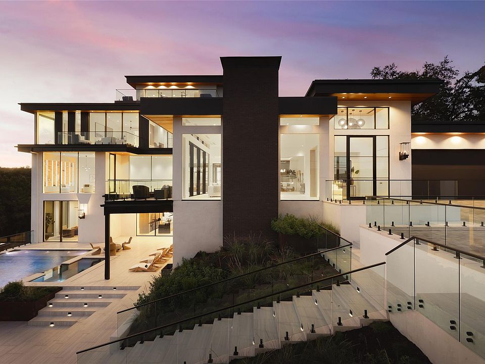 Newly completed, The Onyx is among the most significant residential offerings ever brought to market in Westlake Hills. Defined by rare elevation, sweeping downtown Austin views, and exceptional execution, this architectural estate delivers scale, presence, and privacy at a level few homes achieve. A secure, gated, and privately walled arrival sets the tone for the residence. Spanning approximately 11,000 square feet on nearly an acre, the home was built by Paradisa Homes with an uncompromising focus on proportion, durability, and enduring quality. Walls of glass frame the living environment throughout, including a custom Fleetwood Edge sliding system—the largest of its kind—opening to uninterrupted city and Hill Country views. Interior volumes are striking, with ceilings reaching up to 18 feet and light moving intentionally throughout the day. The kitchen is anchored by a 12-foot Milano marble island with Gaggenau appliances, complemented by a fully equipped catering kitchen with Thermador appliances and a glass-enclosed wine vault with approximately 600-bottle capacity. An entire level is dedicated to the owner’s suite, featuring a private lounge, office, dual walk-in closets, safe room, and a spa-like bath with soaking tub, oversized rain shower, and floor-to-ceiling glass framing downtown views. Additional amenities include a private theater, fitness studio with steam shower, library, full bar opening to the pool, elevator, and a fourth-floor Sky Parlor designed for indoor-outdoor entertaining. Outdoor living includes a resort-style pool and spa, cabana with swim-up bar, outdoor kitchen, pool bath, and expansive lawns. A detached guest house offers a kitchen, living space, and en-suite bedroom. Garage parking accommodates 6–12 vehicles with lift capability. Located in Eanes ISD and minutes from downtown Austin.