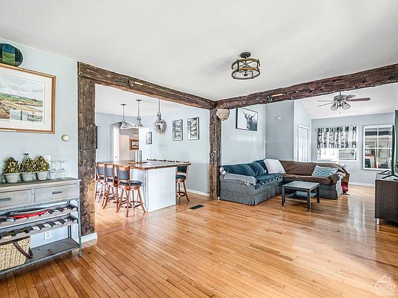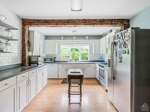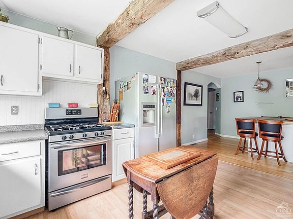 Highest and Best Due by Wednesday 6/26/2024 at 5pm. Step into a perfect blend of rustic charm and modern conveniences with this delightful cottage nestled in the highly desirable West Saugerties area. This home is brimming with character, featuring reclaimed hand-hewn beams, custom built-ins, hardwood floors, and a welcoming covered porch.This property offers three bedrooms, plus a partially finished room that can be finished and serve as a fourth bedroom or home office, and 1 bathroom in the main house, with an additional bathroom in the studio above the detached garage. The bright and spacious living room includes built-in cabinets, a fireplace, and beautiful hand-hewn exposed beams. French doors provide access to a four-season room, perfect for year-round enjoyment. The U-shaped kitchen boasts modern subway tile and cottage charm wainscotting backsplash, along with a stainless-steel refrigerator and gas stove. Ample prep and storage space are available with the U-shape countertops and cabinets. The spacious dining area, with industrial lighting, is ideal for hosting large gatherings.The detached garage's first floor can store two cars and offers additional space for toys and tools, plus a bar and hangout area perfect for entertaining. The second floor features a comfortable studio space with a full bathroom and a balcony, offering a versatile living or working area. Additional amenities include a conveniently located laundry room off the kitchen, a covered front porch, a manicured lawn, and a paved driveway. Located close to dining, shopping, and more in the charming towns of Saugerties and Woodstock, this home offers the best of upstate living with a balance of historic charm and modern amenities. Don't miss your chance to own this unique and flexible property perfect for a variety of lifestyles.Schedule a showing today and discover your new home in West Saugerties. Note to buyers and buyer's agents, the seller has interior & exterior surveillance cameras.