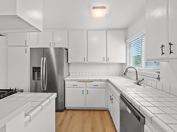 Stunning updated 2 bed 1.5 bath townhome with attached garage and private patio! As you enter, you are greeted with tall ceilings in the spacious living room area, new floors throughout, and modern light fixtures. The split level formal dining and additional living space overlooks the bottom floor of the unit with an array of sunlight entering both sides and a guest half bathroom. Adjacent is the kitchen with stainless steel appliances, and plenty of cabinet / counter space. The staircase leads you to the bedrooms upstairs with a Jack and Jill bathroom with two separate showers, and a new dual vanity. Enjoy plenty of storage space with two large walk-in closets and a washer/dryer at your disposal. A large outdoor patio is attached for entertaining or enjoying the SoCal weather! No need to worry about parking as the unit includes an attached two car garage. The community features a pool and spa. Schedule an appointment for Unit 75 today!