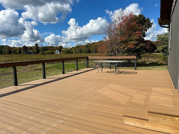 Modern applianced kitchen complete w double door range w 'Pot Filler Faucet' / dishwasher / side by side refrigerator / Quartz counters / silent close cabinets and w open floor plan to living room w cathedral ceiling / pellet stove fireplace / patio doors to spacious deck and gorgeous views. Master Bedroom suite w full private bath and walk-in closet - sliding doors to private deck. Two additional bedrooms and full bath on first floor. Spacious 1st fl laundry room with Samsung Washer/Dryer quartz counter sink and new cabinetry. Full Basement. Central Air. Pole Building w cement floor 32x24. 10.65 Acres. General McLane Schools. Located at the corner of Paved Silverthorn and W Stancliff Dirt Road.