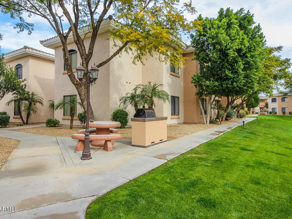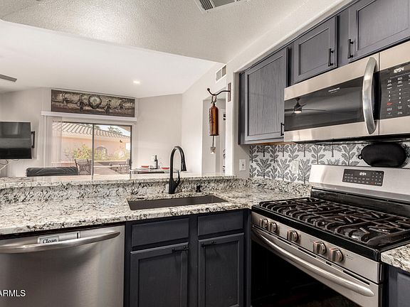 A charming, fully furnished and recently remodeled 2 bed, 2 bath condo in Desert Breeze Villas is now for sale! Short term rental friendly. Discover a sizeable dining & living area w/soft carpet in all the right places and neutral palette throughout. The kitchen comes equipped w/painted cabinetry, granite counters, tile backsplash, a walk-in pantry, high-end SS appliances, and a peninsula w/a breakfast bar. You'll love the primary suite, boasting a walk-in closet, private bath, and private access to a lovely balcony, where you can spend a relaxing summer evening! Enjoy access to numerous Community amenities, from assigned carport parking to a fitness center and a sparkling blue pool! What are you waiting for? Don't let this incredible opportunity slip by!