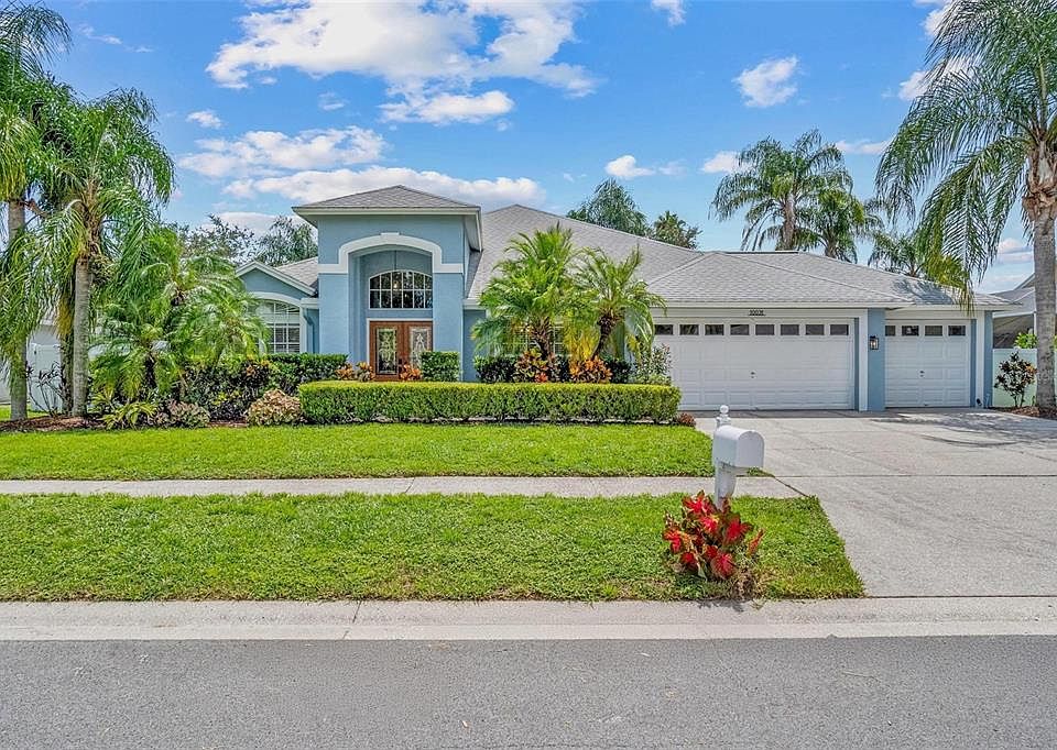 Don’t miss this executive style home with beaming high ceilings and complete with over 2,500 square feet of living space with 4 bedrooms, 3 full bathrooms, and the unique 3-car garage! The kitchen has been upgraded with quartz countertops, slate appliances, and a cozy breakfast nook, making it a great spot for cooking and gathering. All 3 bathrooms feature high-end finishes, including granite countertops, and the master bathroom with walk-in shower, soaking tub, and double vanities is as spacious as it gets! Plantation shutters and upgraded lighting fixtures are installed throughout the home creating a more elegant feel, and the living room stands out with a beautiful granite-surround fireplace and plenty of room for everyone. You'll also appreciate the newly-installed whole-house Culligan water system! Out back, there’s a large tiled screened-in lanai with a wet bar and it all looks over a fenced yard on a larger-than-average lot. The HOA is chalked full of amenities: swimming pool, tennis/pickleball court, baseball field, basketball court, playgrounds, dog park, fitness trail and community center. Located a stone's throw from The Shops at Wiregrass inside of a mature, quiet community, you're a also short car ride to downtown Tampa. Come see it!