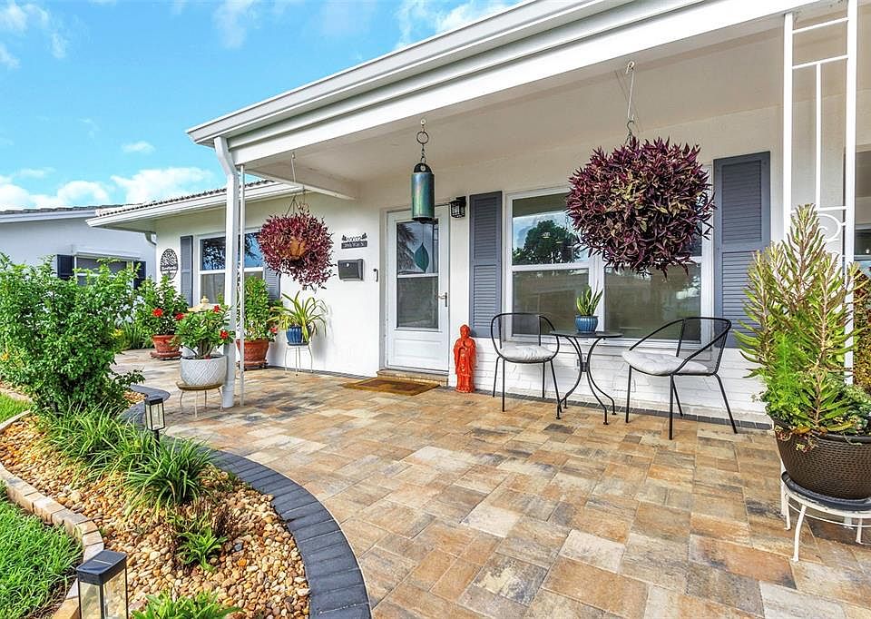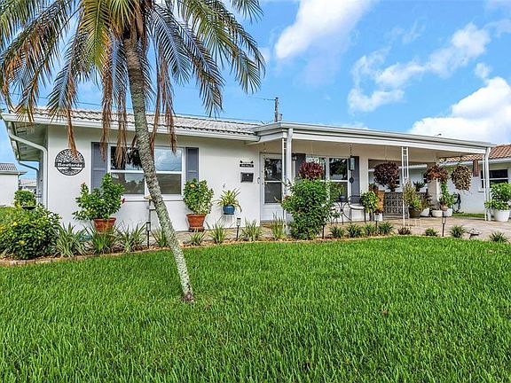 Welcome to this beautifully updated Carlton model in the friendly 55+ community of The Mainlands, Unit Three. This three-bedroom home is truly move-in ready and offers standout curb appeal with fresh landscaping, new paver pathways, a spacious rear patio, a double paved parking pad, and a charming covered front porch. Inside, the open floor plan features a dream kitchen with a large island, quartz countertops, soft-close cabinetry, and brand-new stainless steel appliances. Easy-care wood plank tile flooring flows throughout the home, creating a modern and cohesive feel. The spacious dining area is perfect for family meals and entertaining. At the rear of the home, a versatile bonus room overlooks the backyard and makes an ideal den, home office, or guest space. This room also includes a convenient ensuite half bath combined with the laundry area. Two comfortable bedrooms and a fully renovated bathroom complete the interior. This property truly stands out in a community where many homes look alike — offering unique updates and thoughtful touches inside and out. Unit Three residents enjoy their own exclusive recreation area, featuring a clubhouse with meeting rooms, a stage, a full kitchen, and a library. Outdoors, there’s a large swimming pool, shuffleboard courts, and outside cooking facilities. A full calendar of social events, organized by the Unit Three Social Club, brings neighbors together for breakfasts, dances, bingo, and more. The monthly maintenance fee of $477 covers water, sewer, trash, cable/internet, lawn care, irrigation with reclaimed water, exterior painting and pressure washing, and roof repair/maintenance — making this true maintenance-free living. The community also welcomes golf carts and up to two domestic pets. Conveniently located off US-19, The Mainlands offers easy access to shopping, dining, downtown St. Petersburg, Tampa, and award winning Gulf beaches. Whether you’re seeking a full-time residence or a seasonal retreat, this home delivers the perfect blend of style, comfort, and Florida lifestyle.