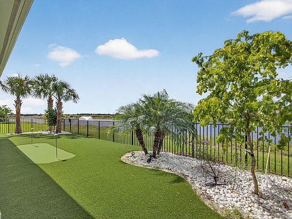 This beautifully appointed 3-bedroom plus office, 3-bath home offers an open and airy floor plan with a bright coastal feel and stunning wide water lake views. Western exposure provides magnificent sunsets that can be enjoyed from the extended lanai patio, creating the perfect setting for entertaining or relaxing by the water. The home features a Tropical-inspired backyard complete with astro turf, a golf putting area, and remote-controlled hurricane patio screens for year-round comfort. Inside, every detail has been thoughtfully upgraded, whole house, Generac Generator, oversized 8-blade ceiling fans with lights in the living areas, bedrooms, and patio, custom blinds on all windows, upgraded light fixtures, and an oversized jetted tub in the primary suite and comfort height toilets. Additional enhancements include, gas fireplace with remote control, extended garage with an additional two feet of height clearance to accommodate large vehicles, finished epoxy garage floor, and custom exterior lighting on a programmable timer. Technology upgrades include extended Wi-Fi coverage to the patio with security monitoring and a zoom feature accessible by phone, along with an upgraded electronic front door lock and doorbell cameras for convenience and peace of mind. All front and back pavers have been professionally glazed, completing the polished look of this exceptional property. Furniture is negotiable, offering the opportunity for a seamless, move-in-ready experience. Experience private, resort-style living at its finest in this vibrant Regency Avenir community. Located in the sought-after Palm Beach Gardens, this community blends contemporary home designs with exceptional amenities, all set in a relaxed and inviting atmosphere. Residents of Regency at Avenir in sought after Palm Beach Gardens enjoy exclusive access to The Pearl, the community's 22,000 sqft private clubhouse offering an onsite activities director, a wide array of special interest clubs, activities, and events. Amenities at The Pearl include a picturesque resort-style pool, spa, pickleball, tennis, two fitness centers, wine storage, card and game rooms, ball room, indoor/outdoor lounge, a golf simulator, outdoor amphitheater, outdoor game area and much more. Conveniently located near Sand Hill Crane Golf Club an 18-hole championship course, The new Nest Par 3 Course and various dining options. Across the street is PGA National's Estate Course, with membership options available. Minutes away from shopping, dining, the Airport, Palm Beach and so much more.