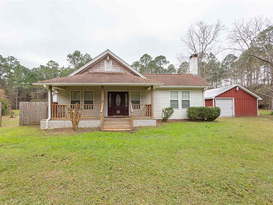 You will fall in love with this charming 2 bedroom, 2 bathroom cottage, situated on 4.33 acres! You wouldn't know you were in Pensacola with this much space, privacy, and peace & quiet, all while being convenient to shopping, beaches, schools, and located just outside the back gate of NAS. Inside, you will find gorgeous hardwood floors with inlays in the foyer and living room, wood beams and wood detail ceilings, massive kitchen with cathedral ceilings, and huge addition on the back of the home which could be used for most anything such as office, dining area, additional living room, gym, conversion to additional bedroom/bathroom, or a combination of these. The exterior of the home features a covered front porch with wood ceiling, screen-enclosed side porch adjacent to a covered deck, plus another covered deck on the back. Multiple sliding and French doors offer easy access to the outdoors and bring in lots of natural light. The detached garage has ample space to provide parking as well as storage and/or workshop space. The rear of the garage has a glass-enclosed greenhouse space for your very own garden. There is plenty of space to park your boat and RV too. The opportunities are endless here! This home comes with a 1-year AHS warranty for the new owner. Call today to schedule your showing!