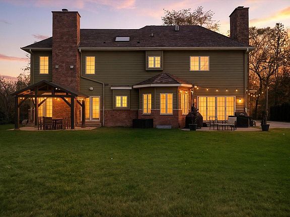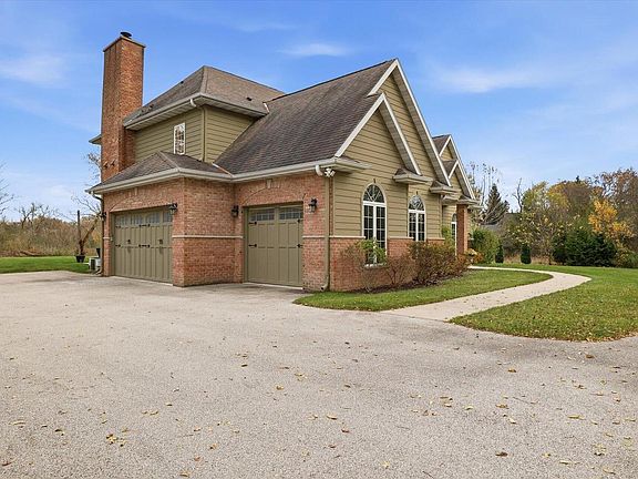 Stunning 4BR, 3.5BA colonial set on 3 serene acres along the Milwaukee River. Built in 2006, this elegant home offers hardwood floors throughout, two wood fireplaces, and abundant natural light. Each bedroom features an en-suite bath, including a spa-like primary suite with tiled walk-in shower, whirlpool tub, dual sinks, and skylights. The 2012 kitchen renovation includes white cabinetry, granite counters, island, high-end appliances, snack bar, and a bay-windowed dining nook. The family room is a delight with wall of windows and patio doors leading to the professionally landscaped backyard. Additional updates include new driveway, patios, gazebo, and extensive landscaping with paths leading to the river. Basement has 10-14' ceilings and is plumbed for bath ready to make it your own.
