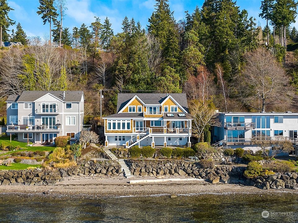Enjoy the ultimate Beach lifestyle on the South shores of Bainbridge Island. Nestled on 75' of no-bank Puget Sound waterfront, this 3-story shingled Gem is reminiscent of Nantucket, with modern, luxury finishes one expects in a home of this caliber. Recently remodeled by Fairbank Construction Company, impeccable craftsmanship offers bright, open spaces with breathtaking water views from nearly every room. Luxurious primary ensuite w/private view deck, fireplace and spa bath w/jetted soaking tub. Chef's kitchen boasts leathered marble countertops, new dishwasher, Sub-Zero fridge & Viking range. Guest suites, an office & media room allow working from home in comfort. Lower patio w/outdoor shower & BBQ is Summer ready!A Dreamy Beach Retreat!