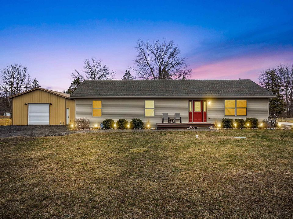 This move-in ready, maintenance free vinyl exterior home is ready for it's next owner! Open concept ranch with soaring vaulted ceilings throughout, giving that grandeur look & feel. Recessed lighting, and large windows allow ample light to flow in. Spacious kitchen features granite countertops and plenty of cabinet space. High end stainless steel appliances included! Convenient full bathroom & walk-in closet in the primary en-suite. Doorwall off kitchen leads to large 14'x14' back deck, perfect for entertaining in the upcoming summer months. Brand new 22'x30' pole barn with all the bells & whistles - heat insulated, floor drain, hot/cold water, & wifi just to name just a few! Shed provides additional storage space. Corner lot on 1 acre gives plenty of room for the pets & kids to play!