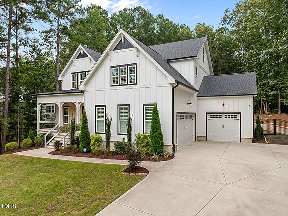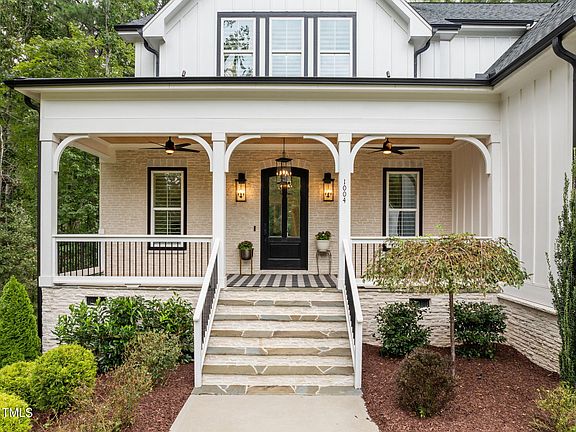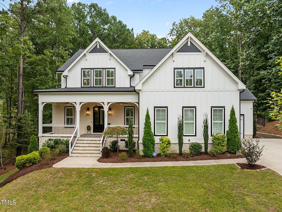 A lovely modern farmhouse (like new) located in the Merriweather sub-division nestledin a quiet neighborhood surrounded by lush trees on a 1.20 acre home site. This beautiful homes offers 4 bedrooms, 3.5 baths, and 3,854 square feet, perfectly situated on a wooded lot. A grand entry foyer with trim-detailed accent wall, crown molding, and a striking cage-style chandelier sets the tone of style and sophistication. A private home office with plantation shutters provides the ideal work-from-home retreat. A spacious family room impresses with engineered hardwood floors, crown molding, wood-beamed ceiling, and geometric chandelier with stone enclosed gas fireplace flanked by built-ins and windows. Seamlessly connected to the kitchen and breakfast nook, this space extends to a screened porch with sliding glass offers a cozy place to relax to a second gas fireplace—overlooking the private fenced backyard with a recently installed custom built stone retaining wall with lights. The gourmet kitchen showcases crisp white cabinetry with cove crown, under-cabinet lighting, quartz countertops, a huge contrasting center island, ceramic tile backsplash, and stainless steel appliances including gas cooktop, wall oven, microwave, and dishwasher. The breakfast nook, wrapped in windows and finished with board-and-batten detailing, is filled with natural light. The first-floor primary suite is a true retreat, featuring engineered hardwood floors, tray ceiling with crown molding, judges panel accent wall, and a spa-like bath with freestanding soaking tub, seamless glass shower with dual shower heads, dual vanity with quartz, and designer finishes. A chandelier-lit walk-in closet with custom built-ins completes the suite with a touch of elegance. A stylish powder room with wallpaper accent, quartz vanity, and decorative mirror, plus hardwood staircase and hallways, elevate the home's character and elegance. Upstairs offers versatile living with spacious secondary bedrooms, engineered hardwood hallway, and a bonus room with accent wallpaper —ideal for recreation or relaxation and for family gatherings. Absolutely Stunning!